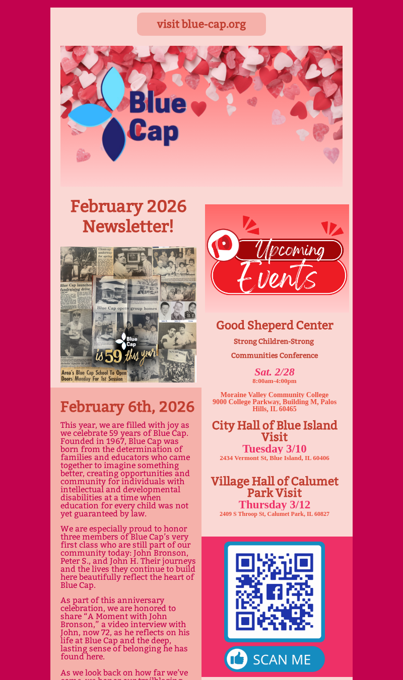 Blue Cap's Vision is that 75% of people served at Blue Cap will be satisfied with family connections, social activities, and their work/volunteer life by June 2027.