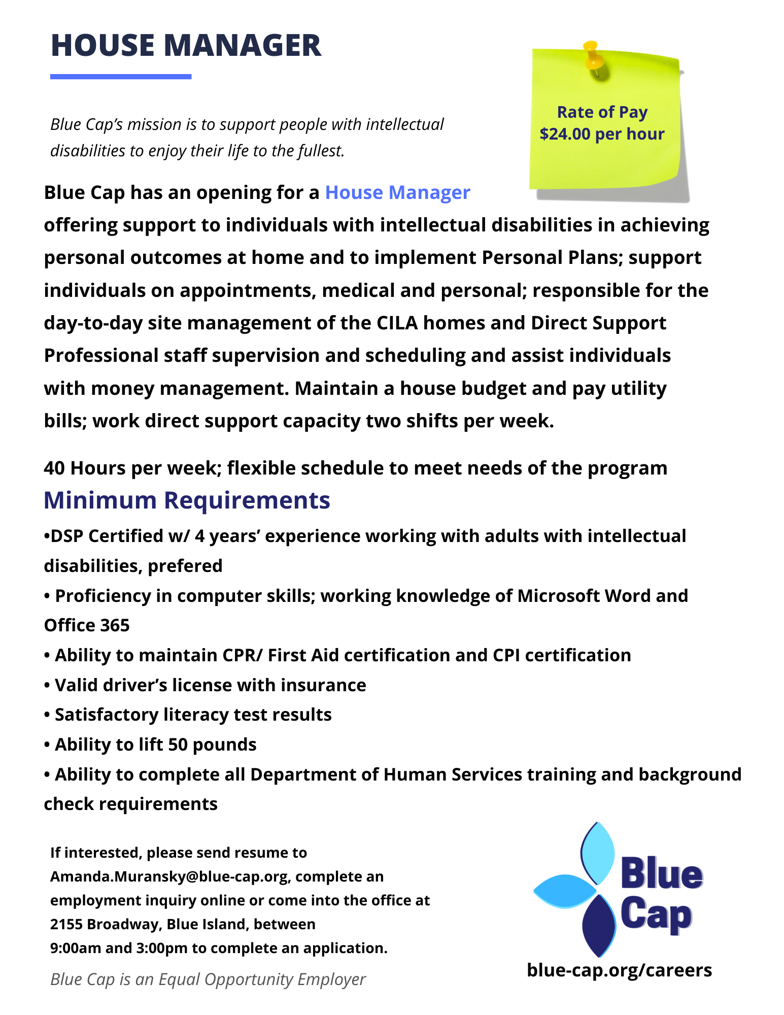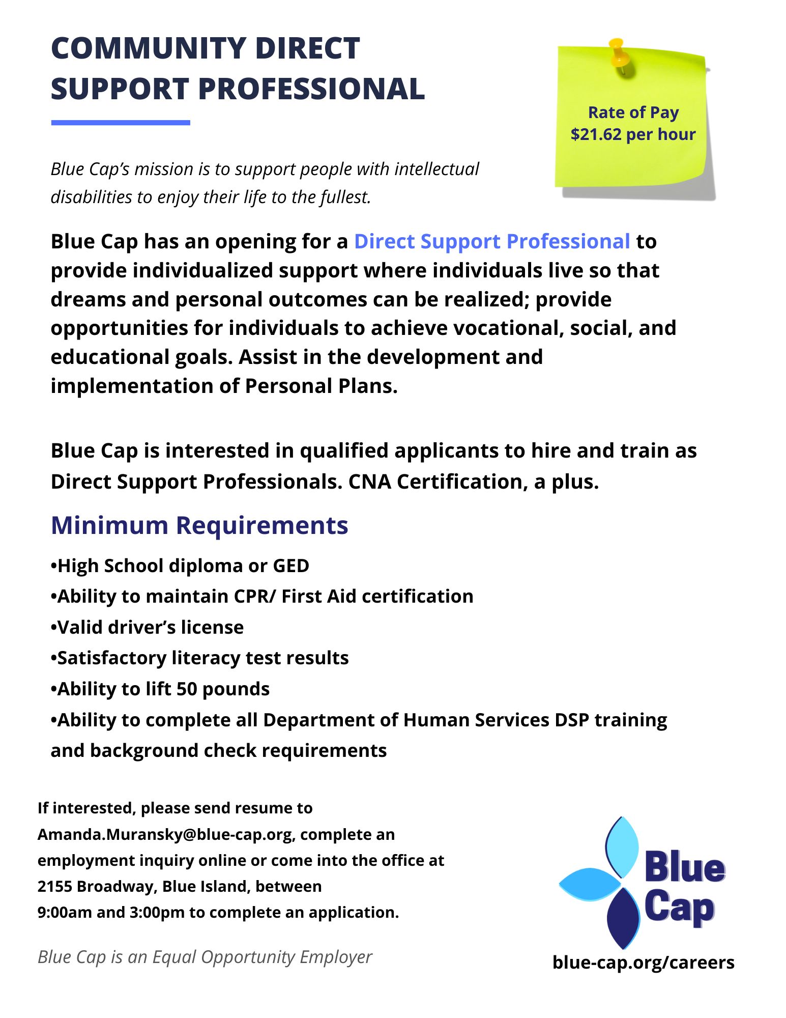 If you are looking for a secure career in which you will truly make a difference in people’s lives, consider Blue Cap. Here at Blue Cap, our work enables people with intellectual/developmental disabilities of all ages to become more independent, active and productive in society. Employment opportunities are available at Blue Cap for energetic people who are results-oriented, flexible, dedicated and work well as part of a team.